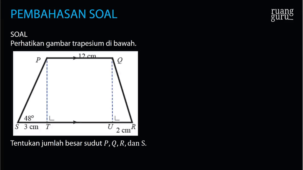 Sifat-sifat sudut dalam trapesium. Tentukan jumlah besar sudut P Q R dan S. Tentukan besar sudut P.